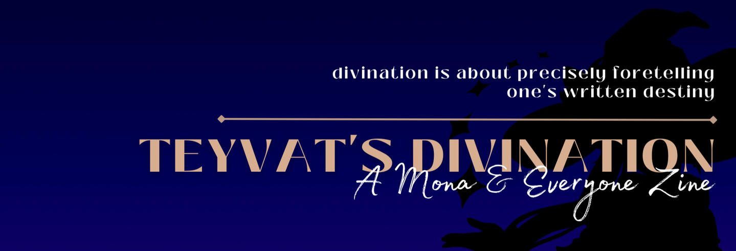 Teyvat's Divination is a SFW digital zine that explores Mona's astrological fate-foretelling of other Genshin Impact Characters.This zine will not only delve into the lore of all vision-holders across Teyvat, but it will also showcase Mona's dynamic with others. Content will combine surface-level interactions between Mona and other characters with an underlying analysis of their destinies.For example, Mona having an itching feeling about Albedo's fated calamity while they have lunch together. Or, in the middle of a spar with Childe, Mona gets a vision of the future Harbinger, weak and worn down.Dive deep into the fates of our beloved characters through the eyes of Astrologist Mona Megistus.